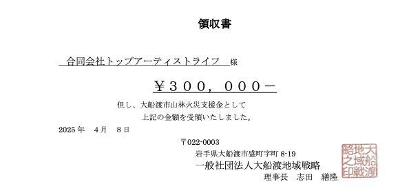 【2025年4月4日 一般社団法人大船渡地域戦略さんに30万円寄付させていただいたことを報告します。】