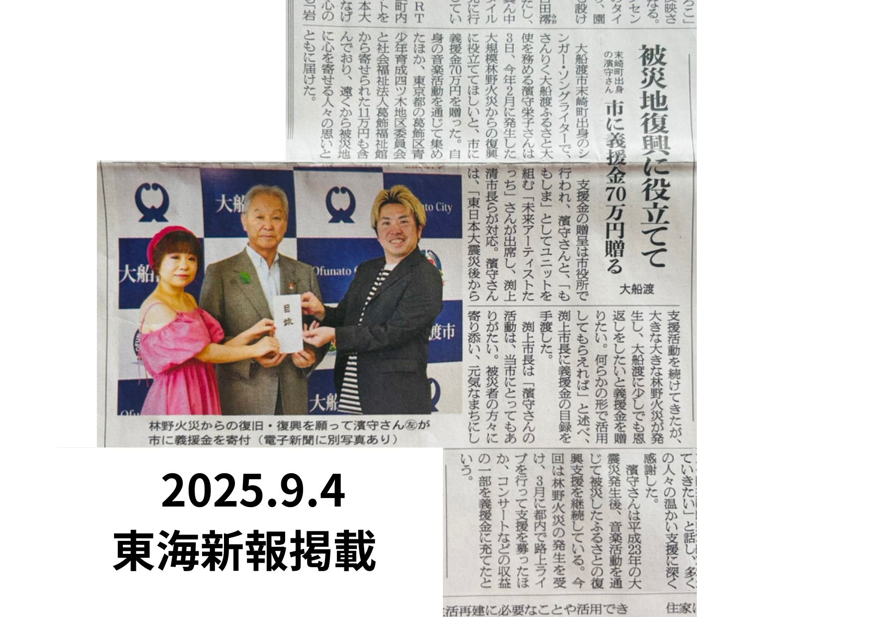 大船渡市長に、林野火災災害義援金として、70万円寄付いたしました。